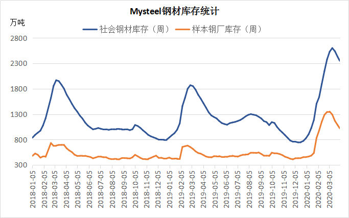 本周钢材库存(厂库+社库)合计3368.72万吨,2019年均值为1680.95万吨,若按照前两周180万吨/周左右的降幅,仍需9个多月的时间才能恢复至去年均值,这是否意味着今年一整年钢材库存都将维持高位?