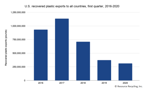 不过,今年全球出口的衰减是由其他国家的类似政策导致的。比如印度,2019年一季度从美国进口了8100万磅(36741吨)废塑料,但印度宣布年末时对废塑料实施进口禁令。因此,今年对印度的出口量仅为1000万磅(4536吨)。