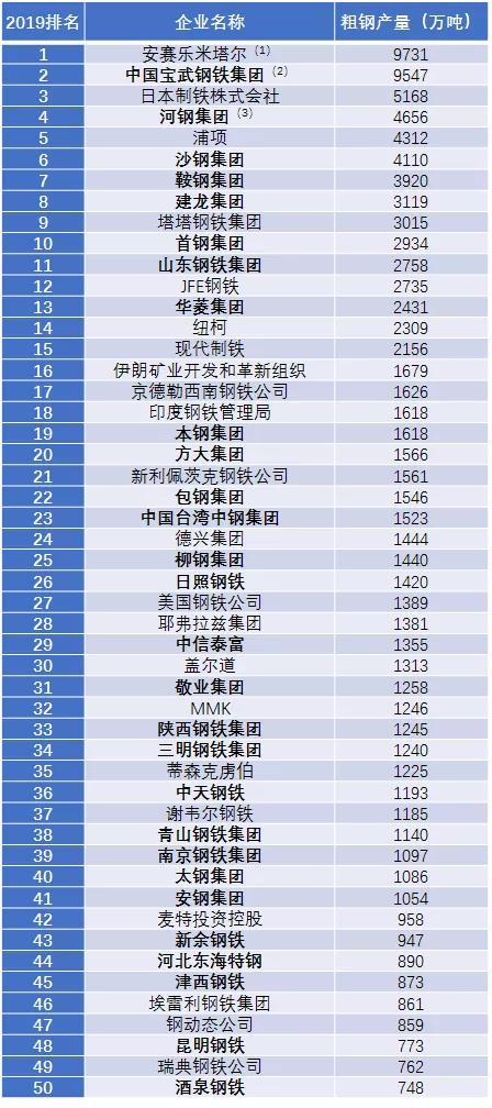 从上榜中国企业数量来看,2019年全球粗钢产量前10名的钢铁企业中,中国有6家钢铁企业上榜(分别是:中国宝武、河钢集团、沙钢集团、鞍钢集团、建龙集团、首钢集团),与2018年持平;前50大钢企中,中国上榜28家,与2018年持平。